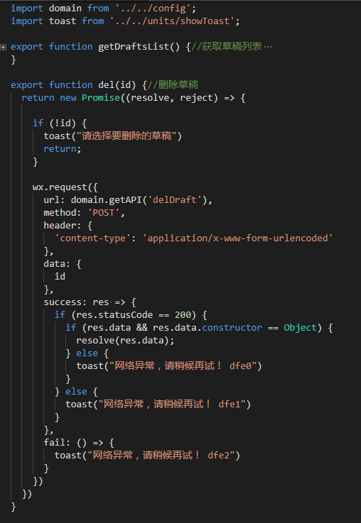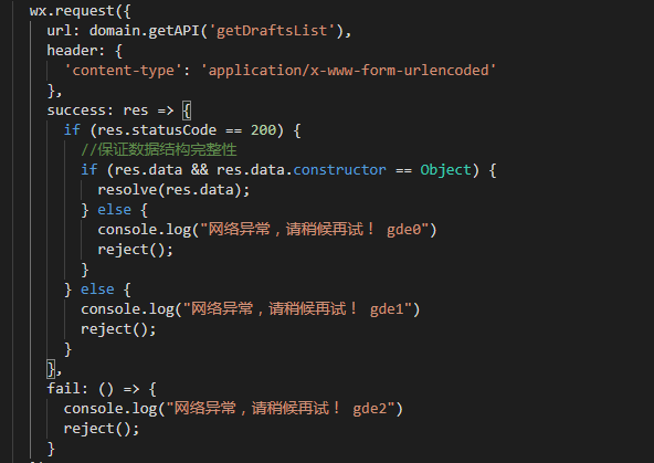 相信多数人请求的方式是这样,包括我以前刚接触小程序的时候也是这样写,这样写不是说不好,而是不太严谨,如果能够正常获取数据那还好,但是一旦请求出现错误那程序可以到此就没法运行下去了,有些比较好的会加上faill失败回调,但也只是请求失败时的判断,在请求成功到获取数据的这段流程内其实是还有一些需要我们判断的,一般我的做法是这样: