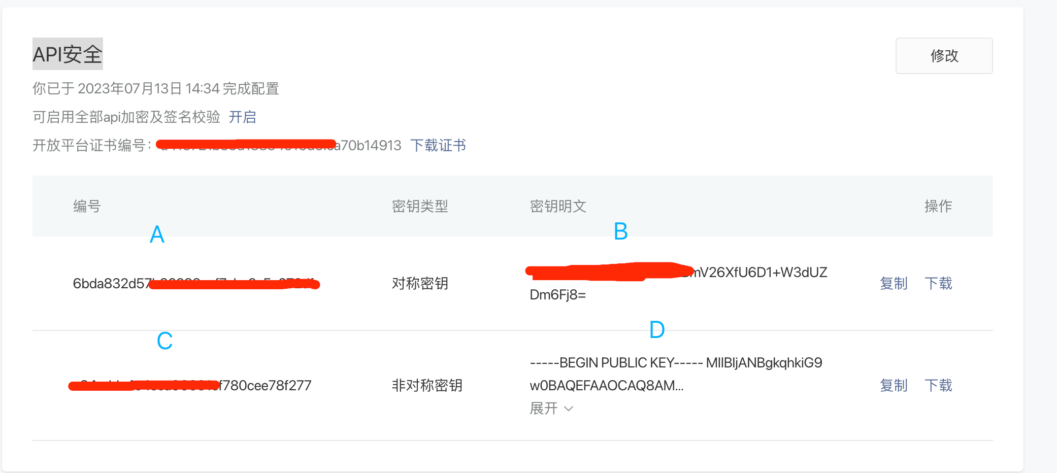 贴图:非对称的密文只有在初始化的时候可以下载(已经开启了的可以按修改,保存前下载,确保下载回来的是----BEGIN PRIVATE KEY----开头的,因为官方前两天有bug,点击下载回来的还是非对称明文,不过腾讯已经说让相关人员去优化了)
