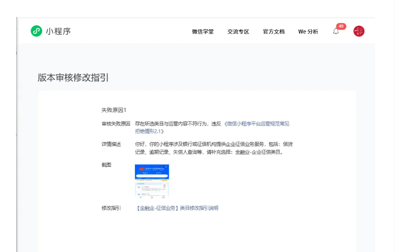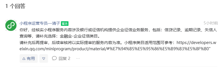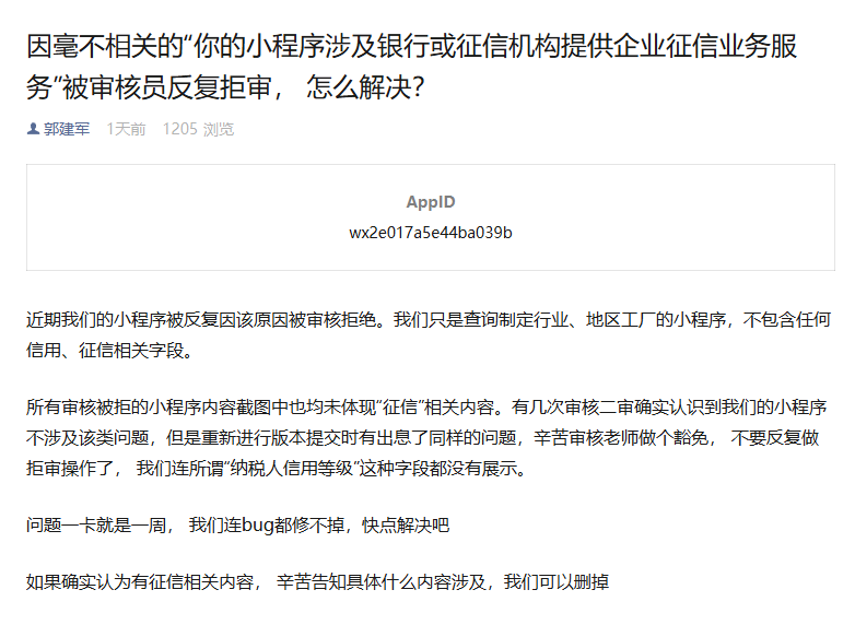 我专门去看了下这个哥们的小程序,一个简单的b2b信息网站,不涉及任何征信查询的功能。 这个社区客服回复的跟审核员回复的一模一样,或许他急着下班吧,明显是粘贴复制的。