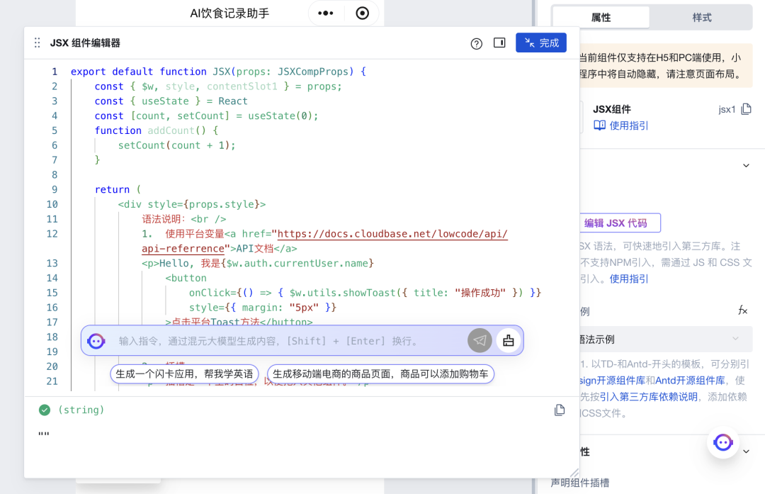 然后点击右边「属性」区域选择「编辑JSX代码」则会弹出编辑对话框