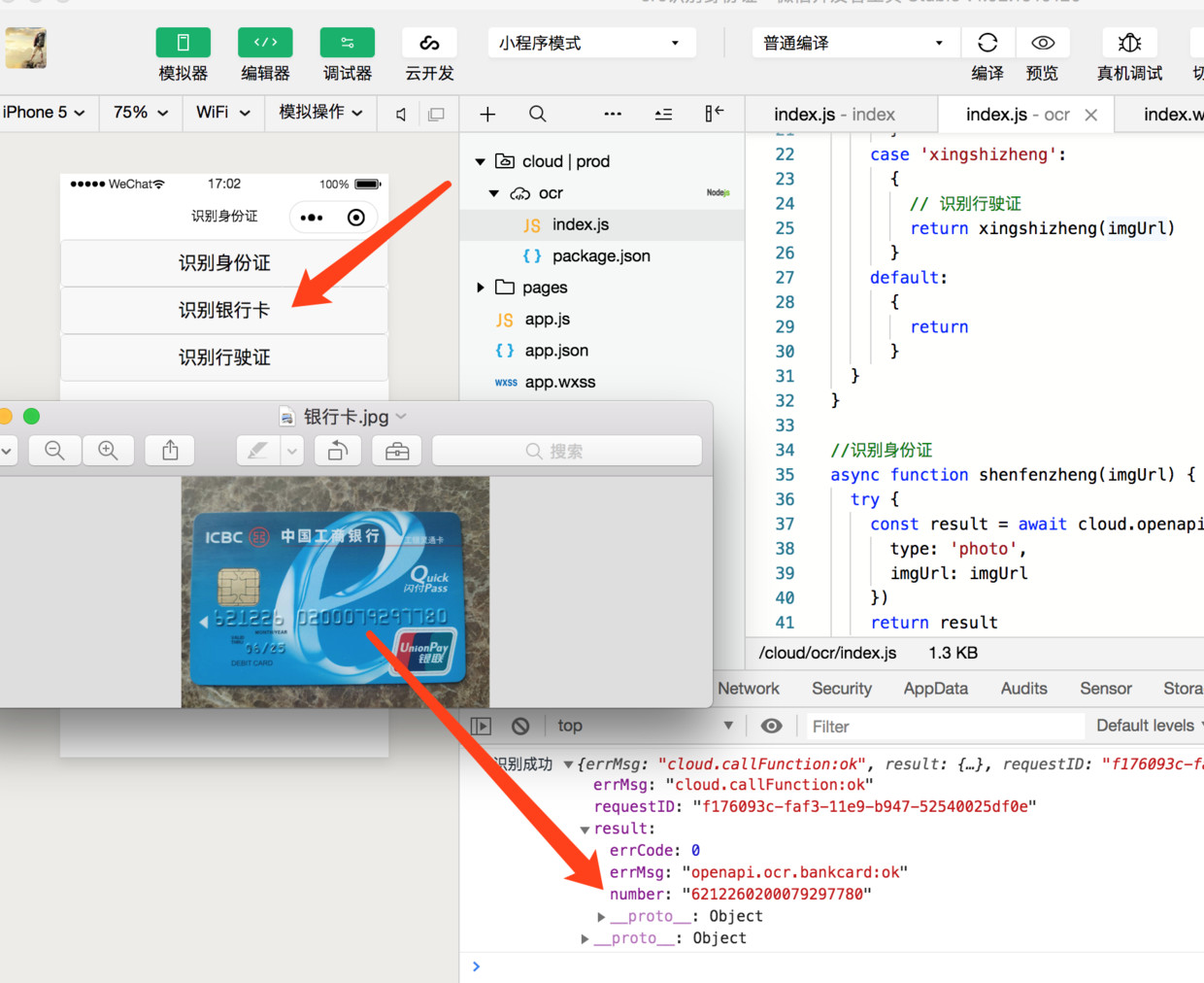 功能其实很简单,就是我们点对应的按钮后,去拍照或者去相册选择对应的图片。然后把图片上传到云存储,会有一个对应的图片url,然后把这个图片url传递到云函数,然后云函数里使用小程序的开发ocr能力,来识别图片,返回对应的信息回来。如下图所示,我们识别银行卡(身份证什么的就不演示了,涉及到石头哥个人隐私)
