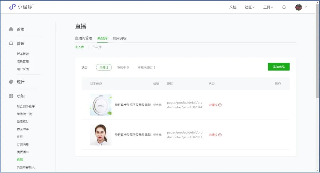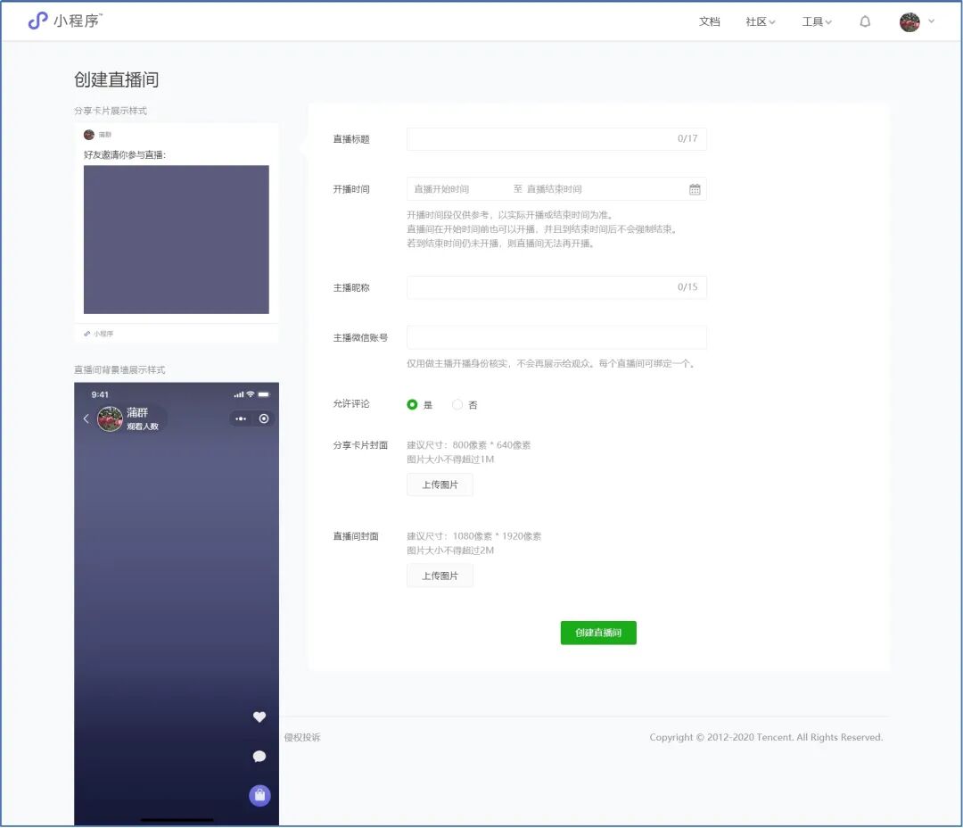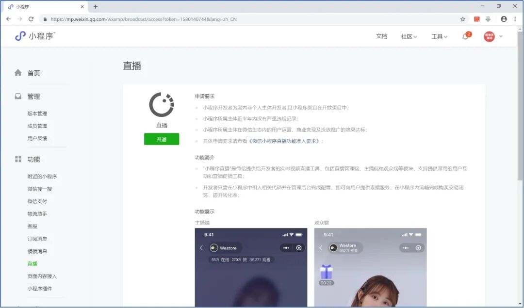 平台需在小程序后台启用直播功能(公测中,未全面开通)。