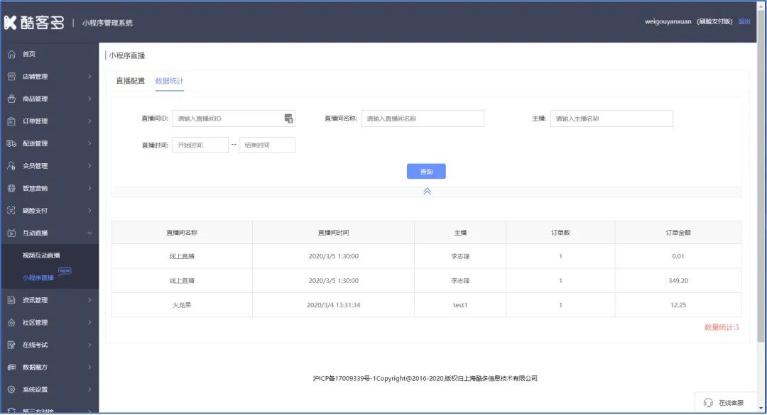 平台方可登陆酷客多后台在【营销推广-营销管理-小程序直播-数据统计】菜单中查看各直播间的带来的订单转化(销售订单,销售金额)。
