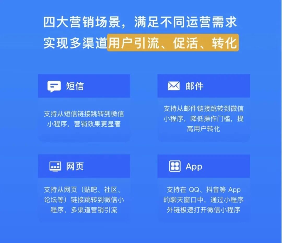 2021 年初,微信支持短信、邮件、App、网页外部链接跳转到微信小程序,基于该开放能力,商家可全渠道向目标用户推送活动消息,用户点击链接直达小程序平台,了解详情。整个过程降低了用户的使用门槛,最大化提高营销内容的转化效果。