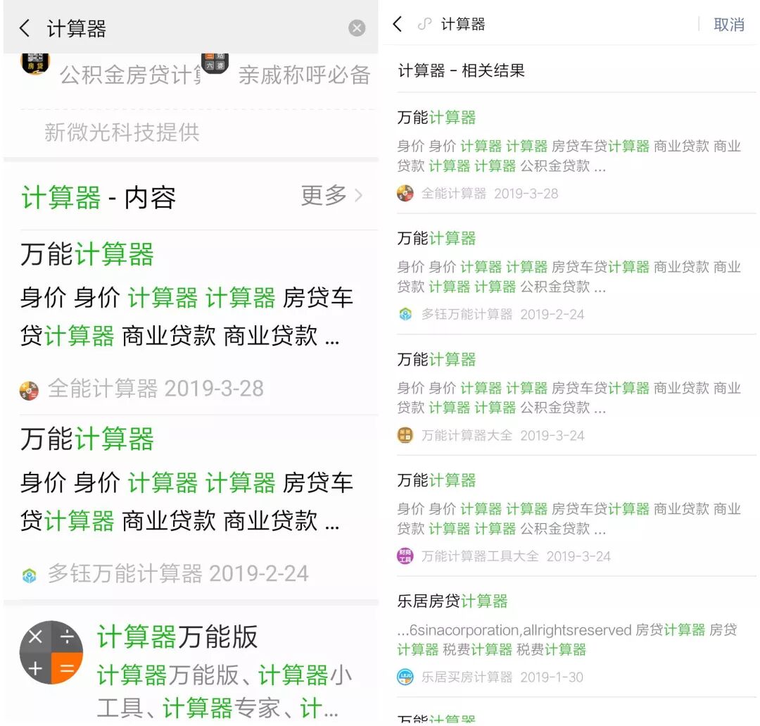 乍一看有些云里雾里,实际上,这项能力在微信安卓7.0.4版中曾灰度测试过,让我们能一睹真容: 只要开启了该功能,小程序每一个页面都能被直接搜索到,比如搜索“计算器”,在内容一栏中就会展示页面中含有“计算器”的小程序,点击之后直达该页面。 也就是说,理论上所有小程序页面都能被用户搜索,上百万个小程序的内容全部被打开,连成了一片信息的汪洋大海。 小程序SEO时代来了 对于这项能力,有开发者用了“太震撼”三个字来形容,并且认为它的重要性不亚于去年的下拉“小程序桌面”。 为了更深入了解它,我们不妨以搜索巨头百度作为参考。 众所周知,只要在搜索框里输入某个关键词,结果页就会展现出某个网站中含有该关键词的页面,点击直达该页面,这是页面收录功能的基本形式。 我们可以小程序比作“网站”,以前只能搜索“整个网站”,现在可以搜索到里面的页面了。 百度小程序前段时间推出了一项能力,就是把小程序拆分为一个个网页,并被搜索引擎抓取。微信此项新能力与此类似,也是通过搜索直达小程序页面。 但百度智能小程序接入搜索的方式比较复杂,需在开发者工具中将小程序Web化,然后上传审核发布。 另外,尽管以前微信也推出过搜索直达页面功能,即“服务直达”和“好物圈”,但都需要开发者主动申请配置,对于中小商家而言,有一定的技术门槛。 而这一门槛现已不复存在,因为小程序“页面收录设置”默认开启,所以商家不需要任何操作,就能被收录到微信搜索中。 然而,收录仅仅是开始,更重要的是,此后所有商家都能通过对页面结构的优化,使小程序的排名更加靠前,获取更多搜索流量。 正如微信团队给我们的回复所说:“这一体验优化,可以帮助用户缩短寻找服务的路径,提升搜索效率,也可以帮助开发者的小程序获得更多曝光。” 换句话说,小程序SEO时代从这一刻真正到来了。 微信搜索是小程序的下一站 不过,在晓程序观察(yinghoo-tech)的调查中,也有商家表示质疑,用户有在微信里搜索的习惯吗?微信搜索的流量大吗?做小程序SEO有意义吗? 商家的疑惑情有可原,毕竟“流量”是所有商家都关心的话题,也是最原始驱动力之一。 确实,我们采访过的案例大都表示“功能直达”、“好物圈”等入口的量并不大,使用习惯尚待养成。 但我们认为,搜索未来必定成为微信小程序的重要入口,理由有两点: 1. 内容才是养成习惯的关键 从用户侧来说,互联网从PC端走到移动端,在交互体验、使用场景上都发生巨大变化,而搜索的习惯却继承了下来,像搜索巨头百度,每日需要响应60亿次的搜索请求,可见搜索依旧是获取信息和服务的重要方式。 并且,搜索行为往往与需求相伴,这与小程序“即用即走,触手可得”的特性也天然契合:需求产生——搜索小程序——使用服务——离开小程序,这条路格外顺畅。 但有人会说,“搜索是日常行为不假,但习惯在微信里搜索的人却不多,抢占搜索流量有意义么?” 我们不妨逆向思考这个问题,许多开发者表示,现在微信搜索最大的问题反倒不是使用习惯,而是缺乏内容,比如搜“羊毛大衣如何清洗”,完全得不到任何结果。 但未来小程序页面收录功能全面上线后,所有有关“羊毛大衣如何清洗”的小程序页面都会被抓取到,可能是一篇文章,也可能就是羊毛大衣清洗服务,由此实现了搜—看—买的过程。 所以有理由相信,未来搜索结果的内容丰富度不再是问题,用户习惯的养成也就水到渠成。 2. 搜索将带来下一波流量红利 从商家侧看,搜索将带来下一波微信的流量红利。 以前,微信小程序的社交属性被过度放大,众多运营者们通过各种方式诱导用户转发分享,从而实现数据短时间内的爆炸增长,这对用户体验是巨大伤害。 所以我们发现,微信一直在通过诸如限制跳转数量、收回分享回调等方式,逐步规范小程序的社交裂变行为,2019年第一季度,确实没有再看到现象级小程序的刷屏事件。 有开发者表示,“社交流量带来的第一波红利期已经渐渐褪去,下一个取而代之的流量洼地应该是搜索”。 因为搜索能让所有商家不论大小,都站在同一起跑线上,流量获取更加平等化。 意思是在相同的搜索规则下,小团队开发的小程序通过页面结构的优化,提供更优质的服务,一样有机会排在头部小程序前面。 比如,在除去使用过、好友用过、功能直达等客观因素外,现在搜索“北京天气”,结果页是「墨迹天气」排第一。但在未来大家公平角逐时,「北京天气查询」这样的小程序,也有机会通过页面优化排在最前面,因为提供的服务更加精准。 这对于中小开发者而言无疑一大助推。 微信一直在关注如何让优质的小程序被更好的发现,目前来看,让服务与产品质量更高的小程序通过搜索入口自然涌现,这是微信给出的答案。 小程序SEO,需要提前这几点 那么,商家如何提前落子,布局微信搜索呢?或许从传统搜索引擎的SEO方法中,可以获得一些思路。 “过去做SEO 的方法是:结合站点属性和需求词数据,根据搜索引擎平台提供的索引规范和页面结构标准指引,不断进行调优化,从而提高索引收录排名的可能性”飞虎商联产品负责人周圣伟说到,他有着多年的建站以及SEO经验。 但目前小程序页面收录能力仍处于内测,没有明确的索引规范,所以我们只能提出一些值得商家注意的地方。 1.先考虑清楚哪些页面允许被收录 需要强调,小程序页面