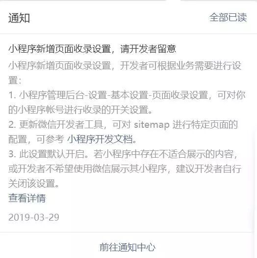 3月29日,不少小程序开发者在后台收到了一条通知,通知表示,小程序新增页面收录功能,开发者可以设置小程序是否能被收录,或者通过配置实现特定页面被收录。