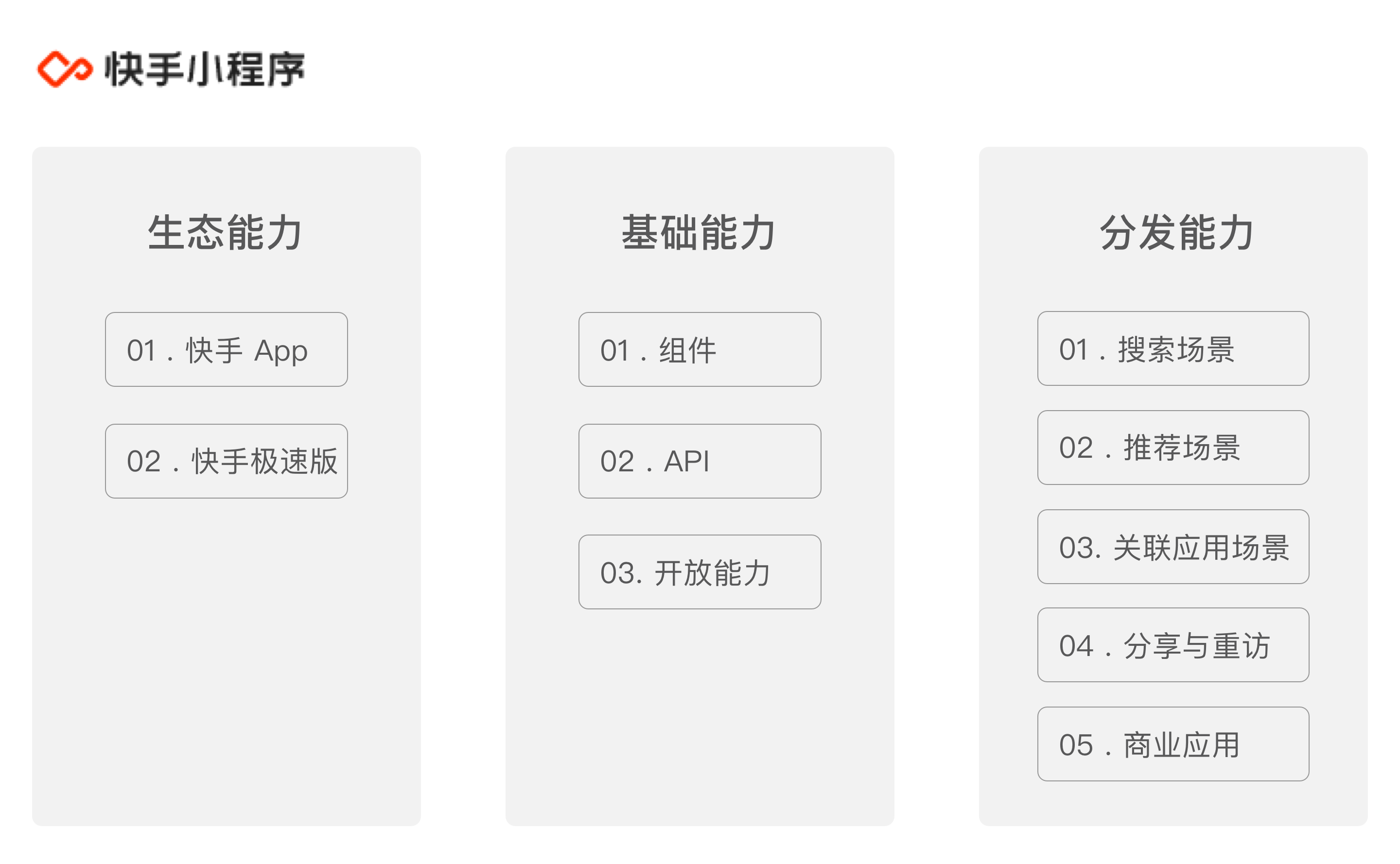 快⼿⼩程序依托快⼿系 App、⽤户体系、开放⽣态、分发能⼒,基于⾏业特性及开发者诉求,提供基础能⼒,结合信息流推荐、短视频挂载、直播挂载等分发场景,帮助企业更为智能、⾼效地连接⽤户。