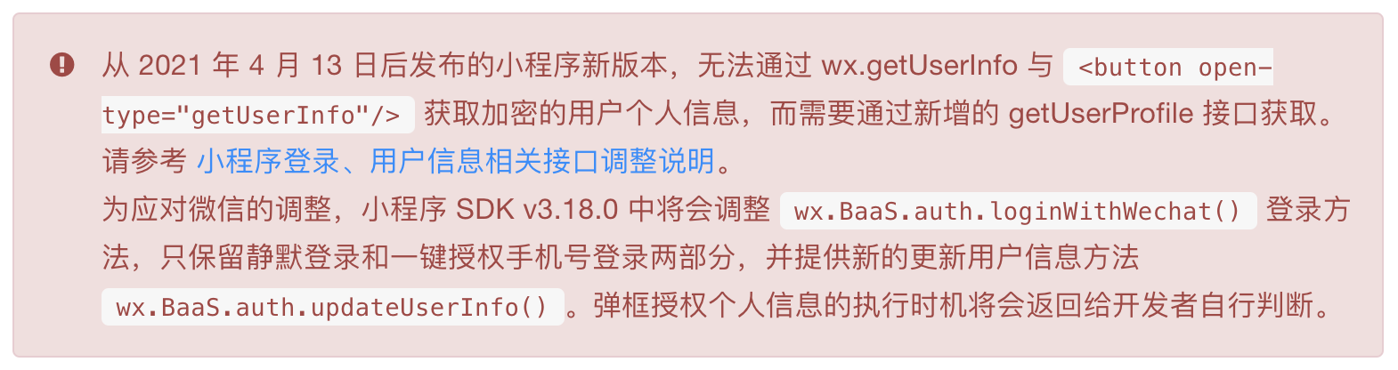 新版微信小程序 SDK 已发布,同步调整获取用户信息的相关接口,详见开发文档。