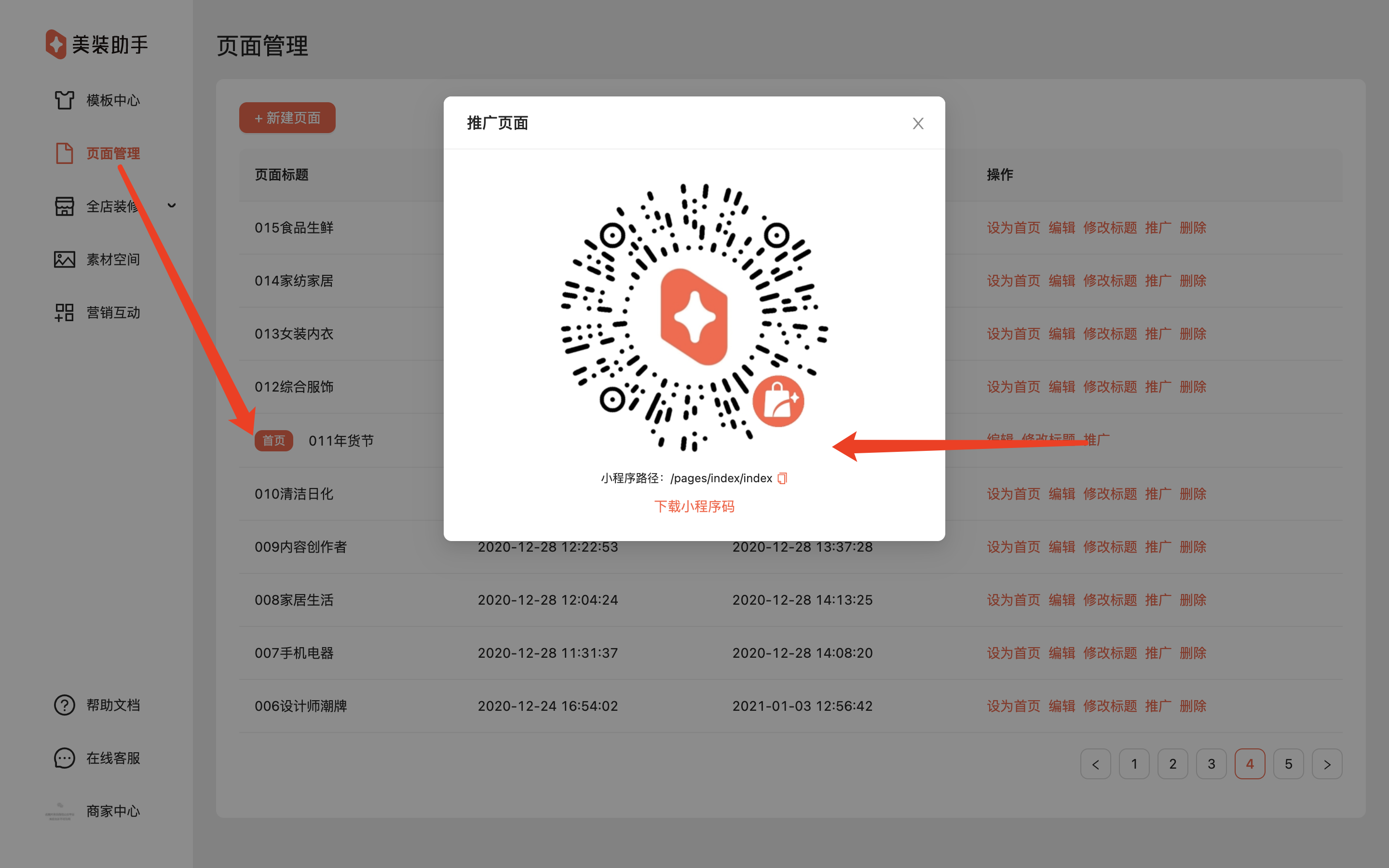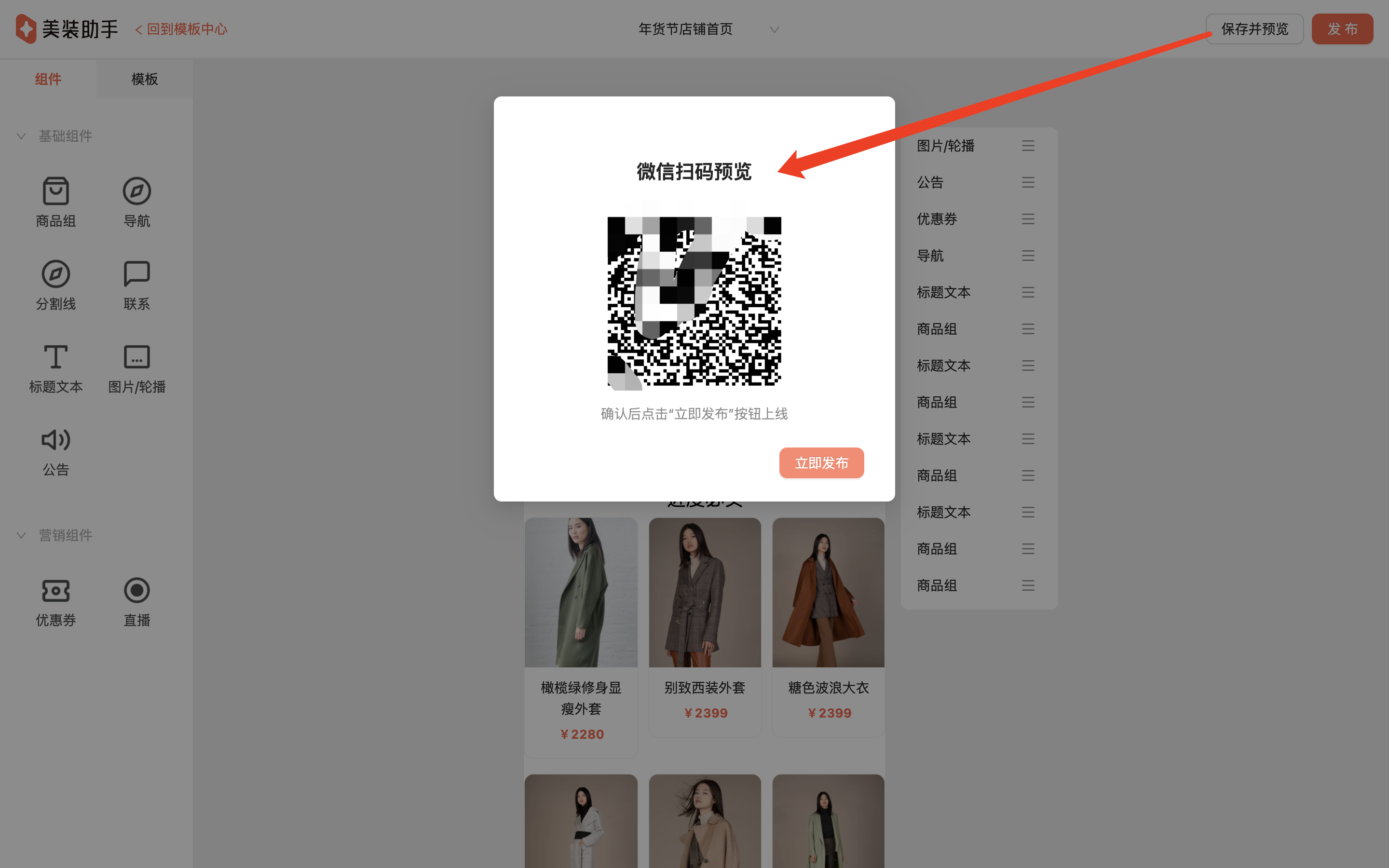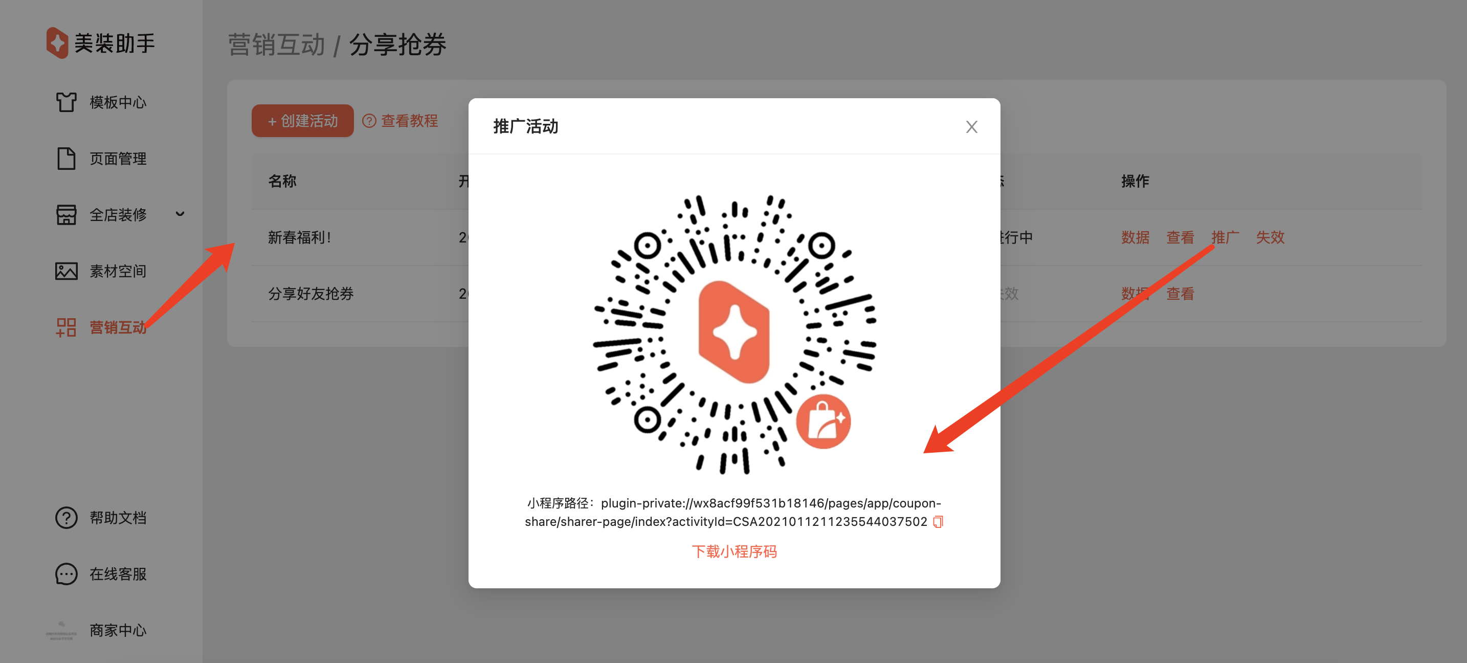 每个页面和营销活动,都支持生成小程序码和路径,大家可以在更多场景(朋友圈、公众号、微信群、企业微信、视频号等)推广你的店铺活动。