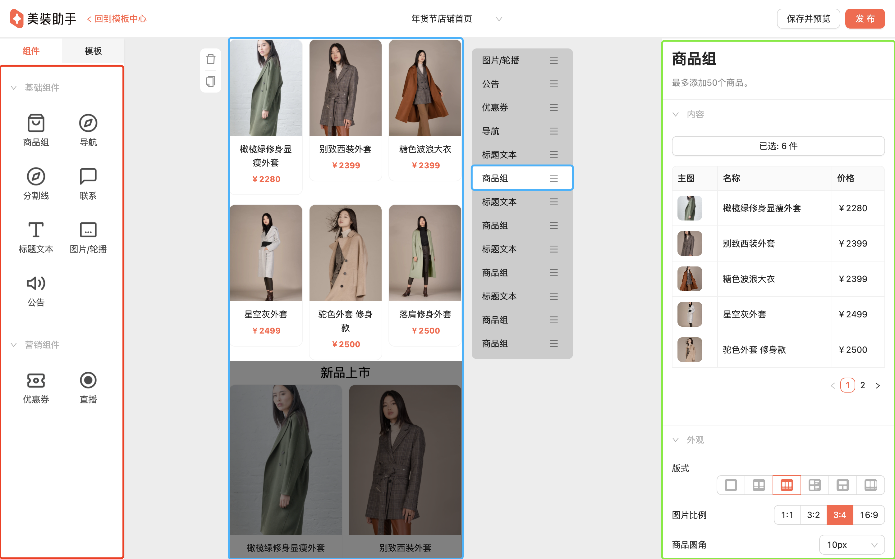 系统已上线的模板点击使用自动创建页面,并自带模板预设组件和素材。