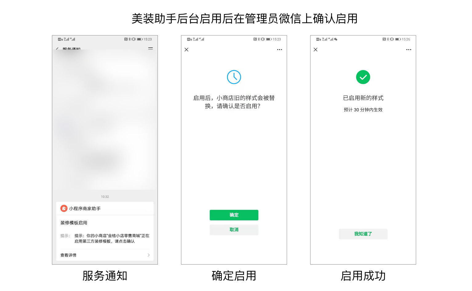 点击发布后管理员微信会收到一个装修模板启用提醒,点击确认即可。