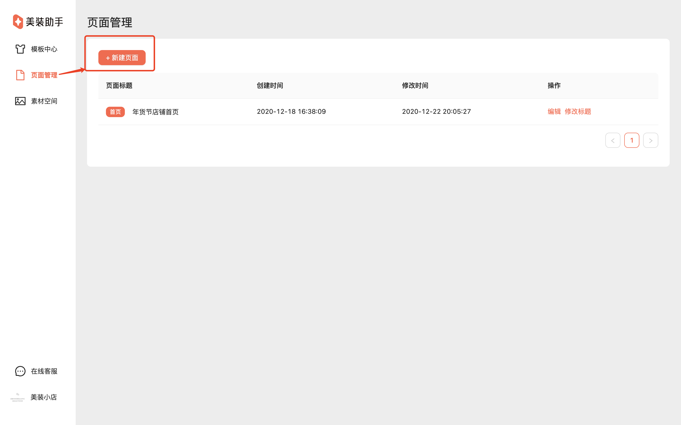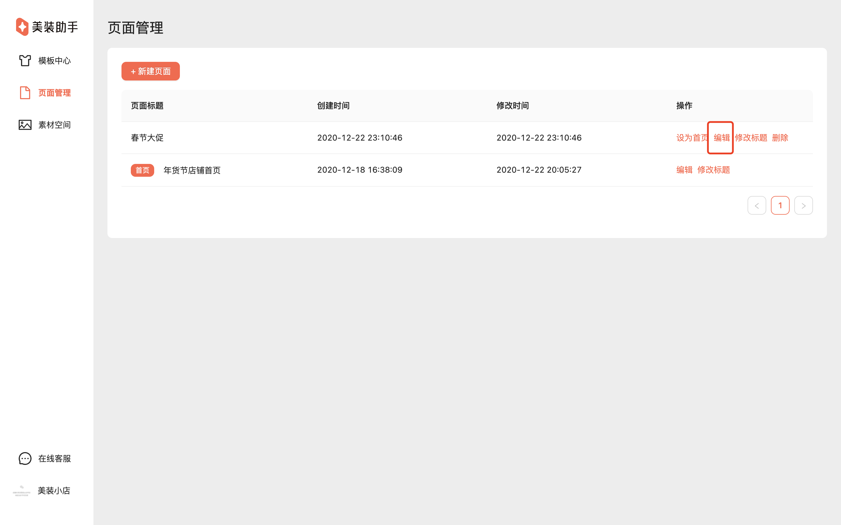 创建页面后点击页面列表的【编辑】进入装修编辑