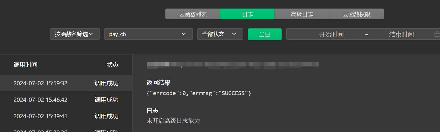 云开发统一下单unifiedOrder回调函数functionName没有回调,云函数本地调试是看不到打印结果的,需要在控制台的日志中查看