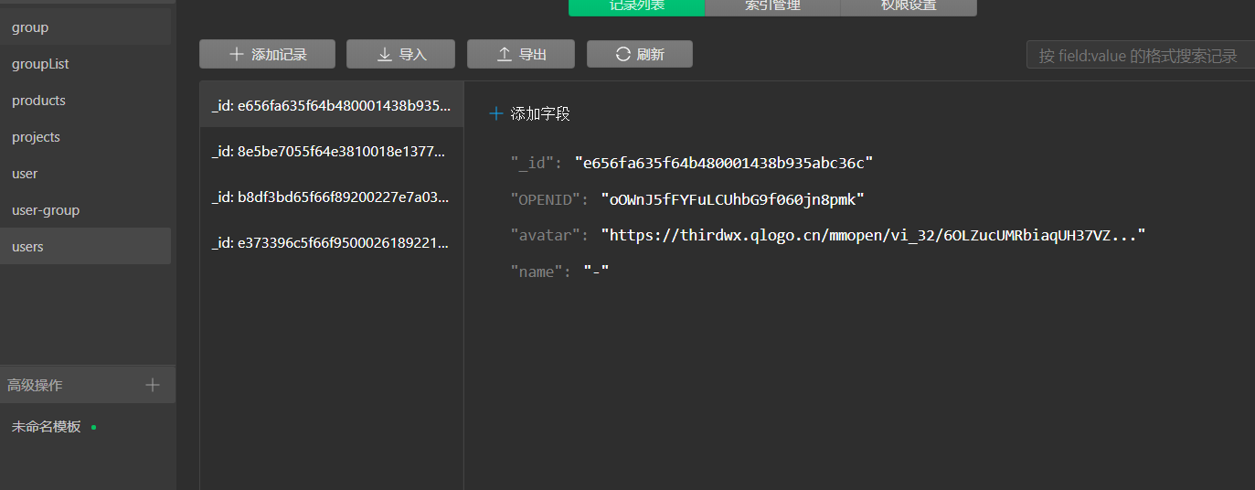 input中的value属性为输入文本,在input的自带属性bindinput绑定一个方法,当输入结束时获取到输入框的内容,以此作为搜索关键词传递给云函数getSearchSuggest,在云函数中拿到数据库groupList当中的字,使用正则模糊查找是否传入值与数据空库中的值匹配,返回数据传回给搜索界面中的数据源。