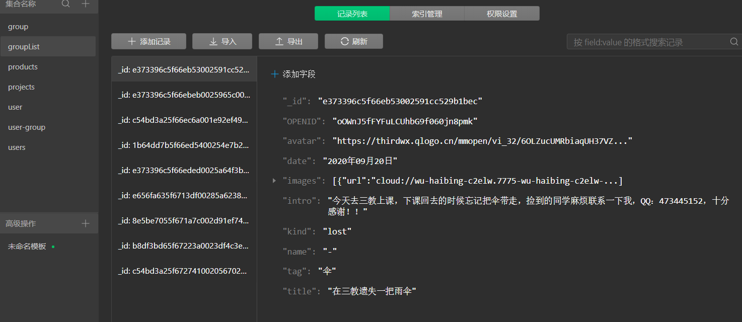 功能实现:三个主页面,第一个lost页面根据tag标签展示客户丢失的物品,第二个sort页面展示客户捡到的物品,所以在这两页面渲染的时候,调用云函数getList.传入kind来区别是lost(丢失) 还是found(认领),传入tag标签来划分证件,书籍,书籍和其他..