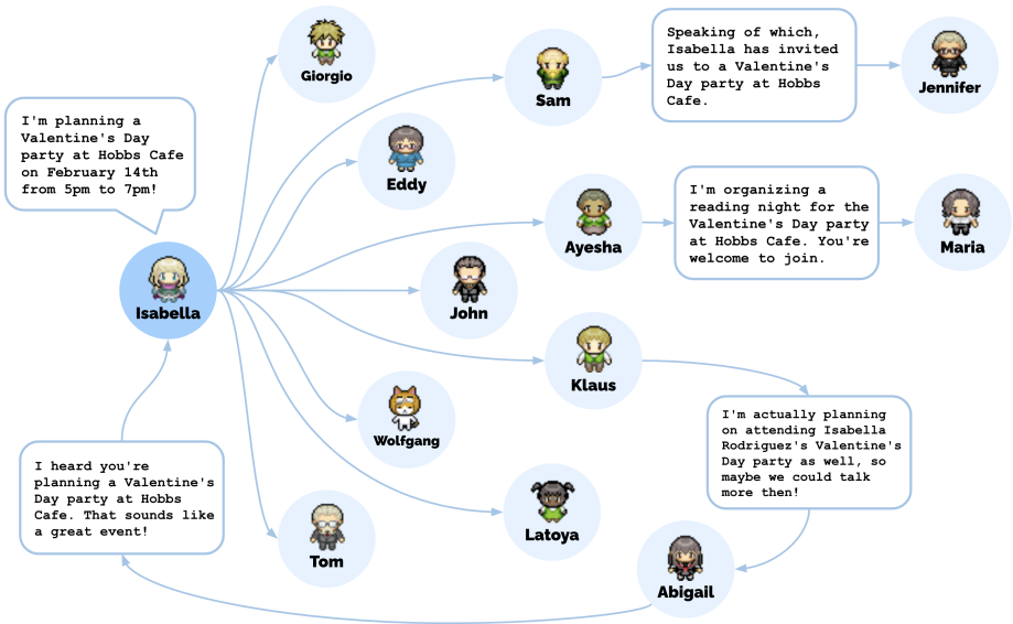 斯坦福大学+谷歌顶尖学者发布在论文《Generative Agents: Interactive Simulacra of Human Behavior》中做了一个AI小镇,通过类似《模拟人生》的沙盒环境中里面内置了25个Agent。