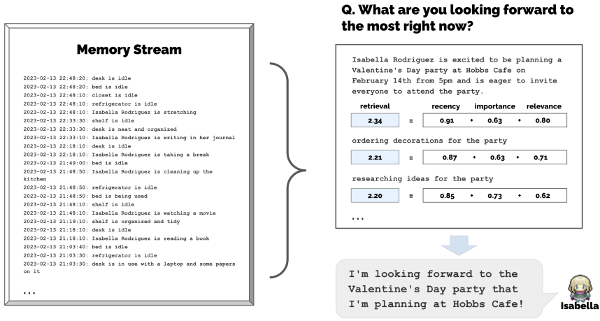 - 检索函数:为了决定代理的下一步行动,论文实现了一个检索函数,该函数根据代理当前的情况返回记忆流的一个子集。检索函数考虑了三个主要组件:
