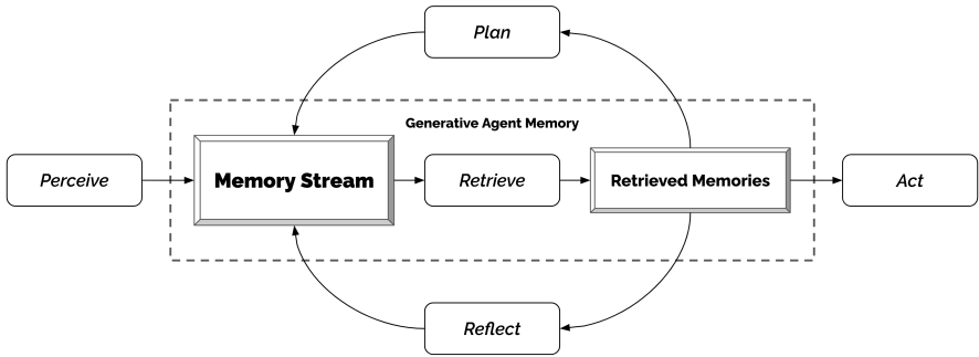 - 记忆流:首先,论文描述了一个长期记忆模块,称为记忆流,它以自然语言形式记录代理的所有经历。记忆对象包括自然语言描述、创建时间戳和最近访问时间戳。