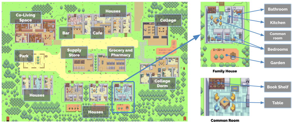 - 环境交互:代理在沙盒世界中移动和与环境中的对象互动。用户可以改变代理的环境状态,例如将厨房炉子从“开启”改为“燃烧”。