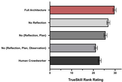 - 可控评估:在可控评估中,论文通过“采访”代理来测试其在自我认知、记忆、计划、反应和反思方面的能力。结果表明,完整的生成代理架构生成的行为最为可信,而移除某个组件后性能会下降。