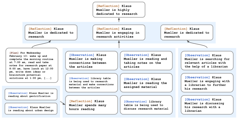 - 反思:其次,论文引入了反思的概念,这是一种更高级别的思维,由代理定期生成。反思通过将最新的记忆记录作为查询,并从语言模型中获取相关记忆来生成。