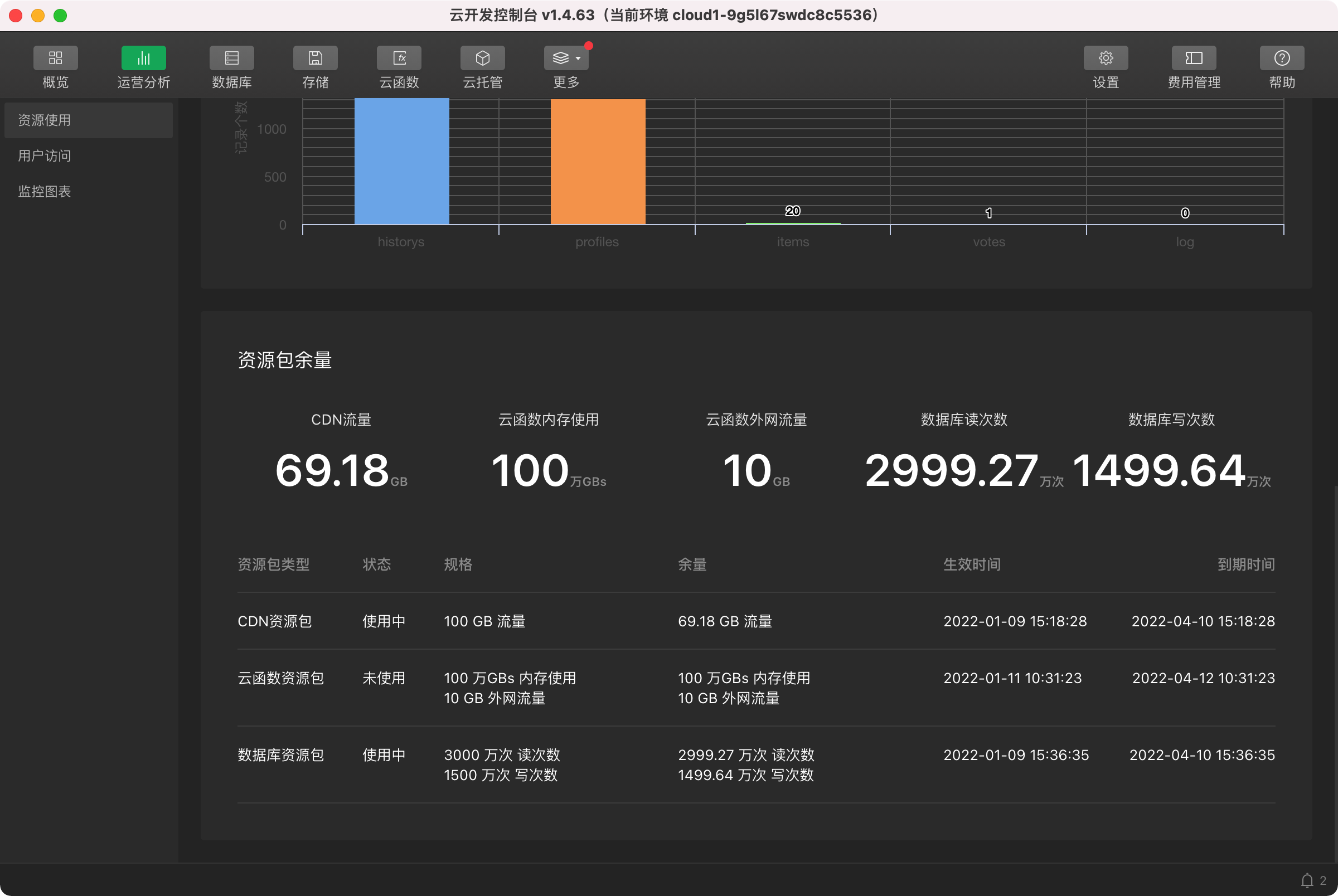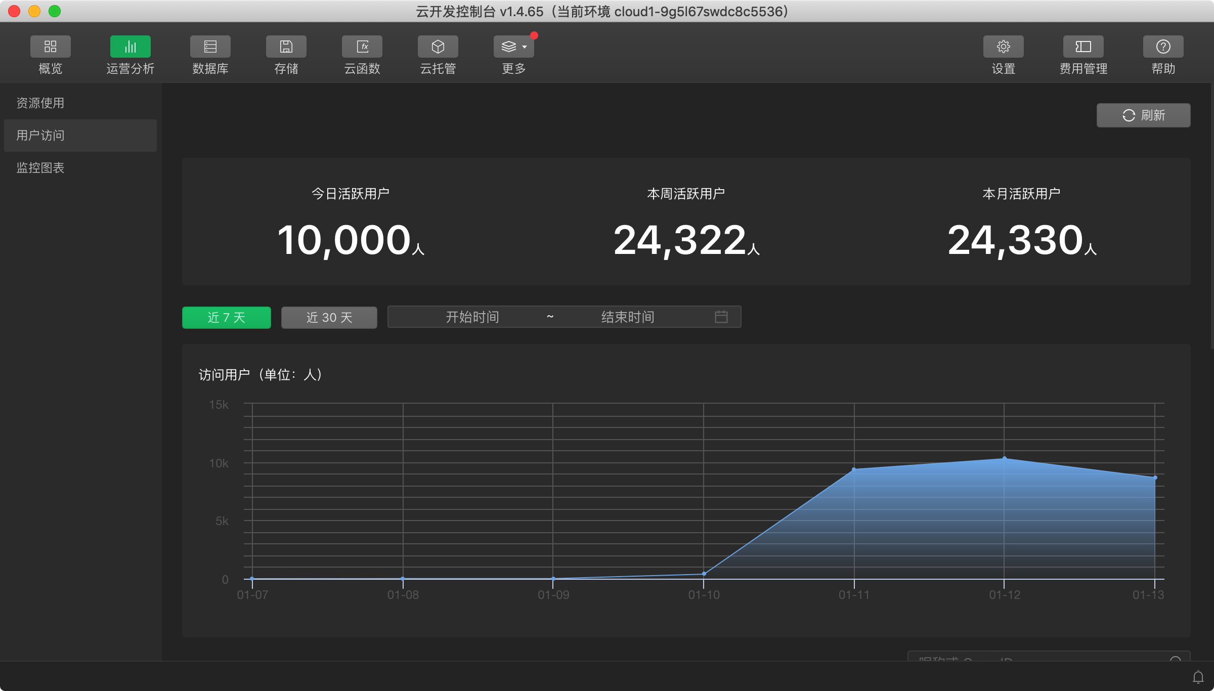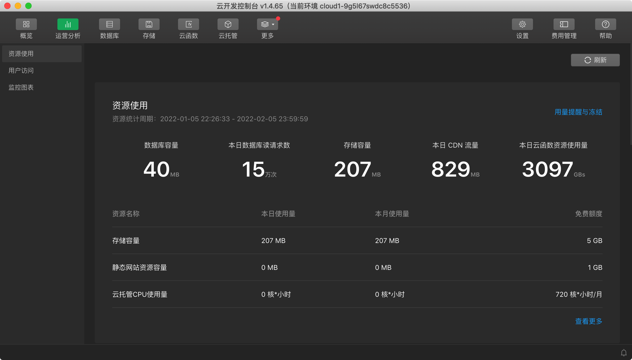 本次选用的是云开发的按量付费服务,考虑到日活能达到10000+,提前充值20元,以备不时之需