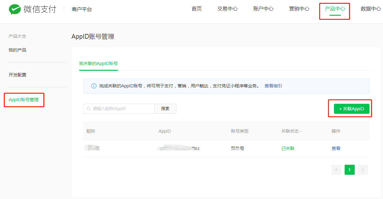 商品中心 —>> AppID账号管理 —>> +关联的AppID 温馨提示:小程序、公众号都是一样的设置