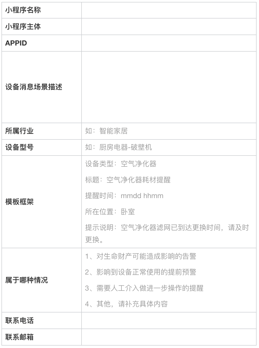 如现有模板无法满足,需申请新增模板,发送邮件至 wx_iot@tencent.com,申请格式如下: