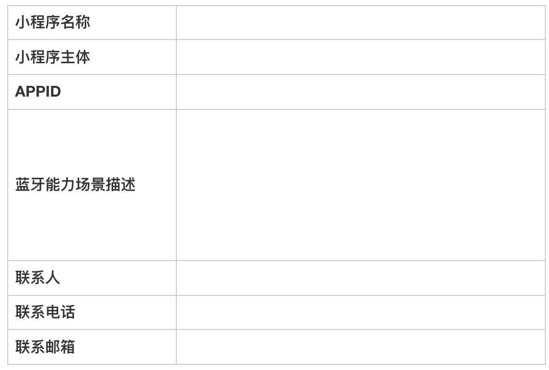 如需申请蓝牙后台能力,请发送邮件至 wx_iot@tencent.com,申请格式如下:
