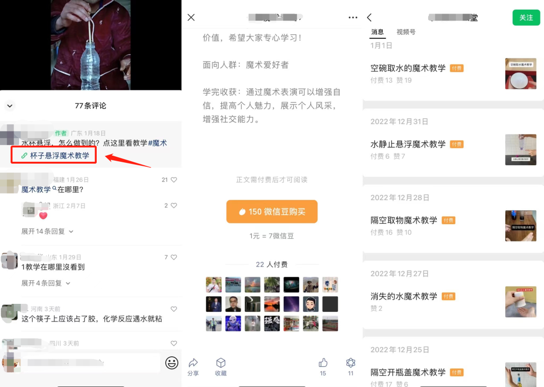 很多魔术类的账号,会在视频号中发布魔术表演视频,但教程留了悬念,在文案中加上公众号的链接,这是个收费的文章。用户需要付费购买才能看教程。