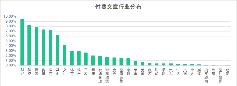据统计观察,付费文章主要集中在5大类:财经解读/股评、小说连载/解读、专业知识/职业技能、资料汇总分享、诗歌散文。