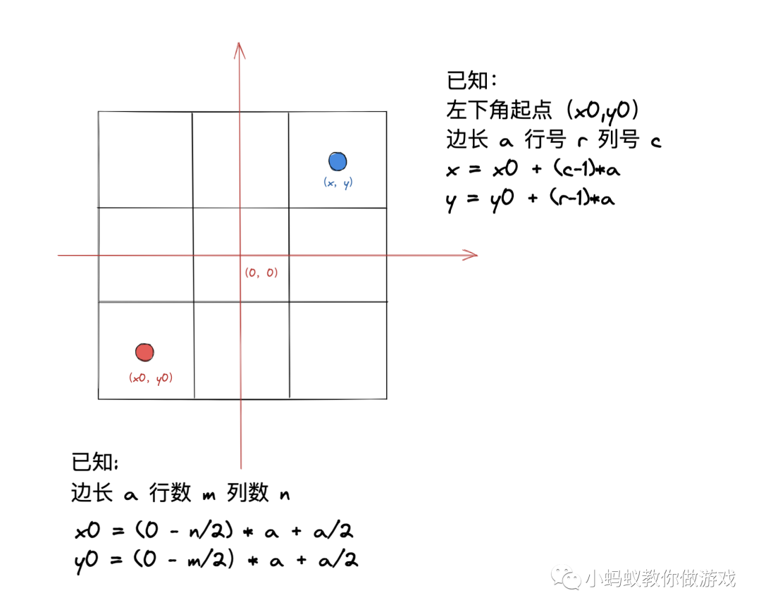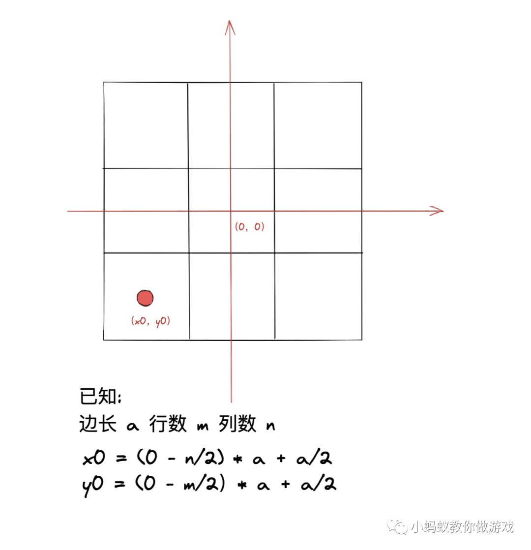 如图,当前的网格布局刚好位于游戏屏幕的正中间,在微信小游戏制作工具中屏幕的正中间刚好是 (0,0) 的位置(在不同的游戏开发工具中坐标系的中心位置会有所不同,有的是以屏幕的左下角或者左上角为中心),现在已经知道了单元格的边长,以及行数和列数,有了这几个数据,能够计算出左下角红色圆点在坐标系中的位置坐标(x0,y0)。