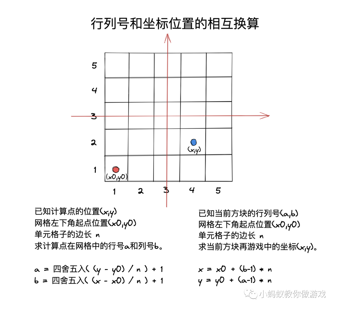 如图,是行列号和坐标位置互相换算的公式。它们的作用是什么呢?比如说,我们拖拽一颗星星在游戏中移动,只要能够知道当前星星的坐标位置,我们就能够知道这个星星在网格布局中位于哪一行哪一列,反之,如果知道了星星在网格布局中的行列号,也能够计算出它当前在游戏屏幕上的坐标位置。
