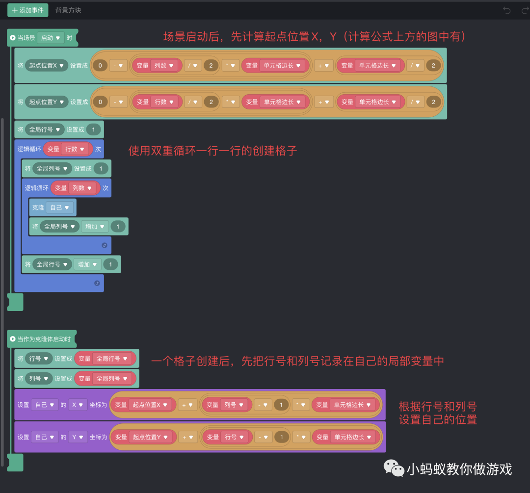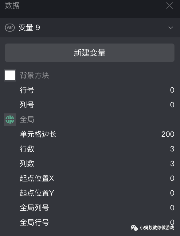 我们要创建的是一个每个格子大小为 200x200 的 3 x 3 的网格布局,所以这里“单元格边长”设置为 200,“行数”和“列数”设置为 3,“起点位置X/Y”表示的是网格布局左下角的起点,“全局行号/列号”用于记录当前创建的方块的行列号。另外这里我们为“背景方块”创建了两个局部变量“行号”和“列号”,目的是让每一个“背景方块”都能记录自己的行列号。