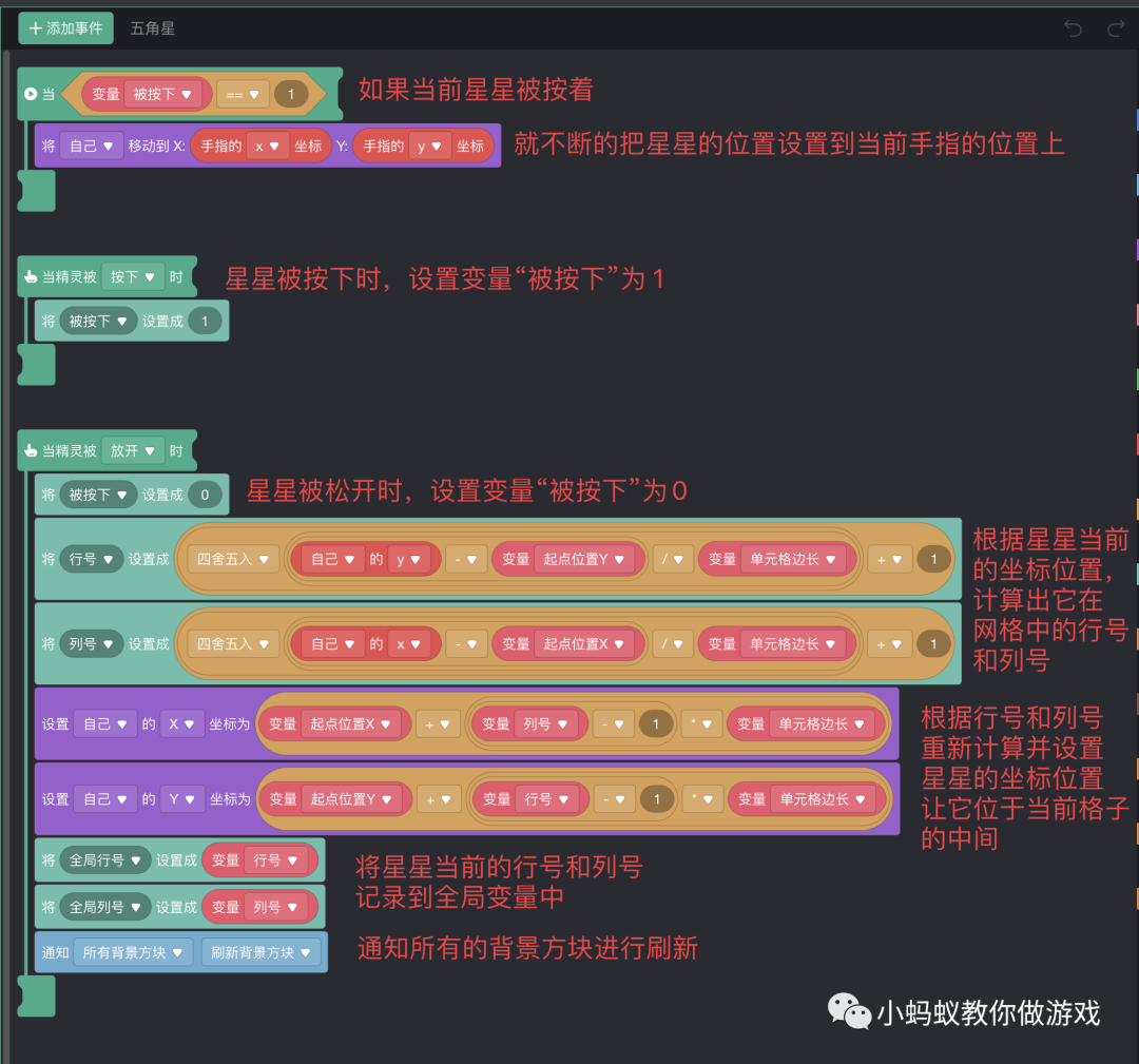 在星星逻辑的最后,使用全局变量记录了当前的行列号,并且给所有的“背景方块”,发送了一个“刷新背景方块”的通知。