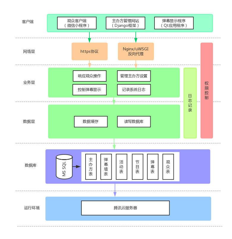 系统设计要求我们首先对于整体系统结构有一个清晰的构想。我们的弹幕小程序的系统架构图如下所示,可以看到这里我们将系统清晰地分为了数层。