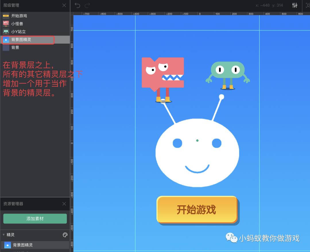 但是,有的时候我们不希望让工具去处理背景的适配,我们希望能够自己去处理背景,这时该怎么办呢?很简单,只需要单独增加一个精灵层,然后把这个精灵层放在背景层之上,其它所有精灵层之下,就可以了。