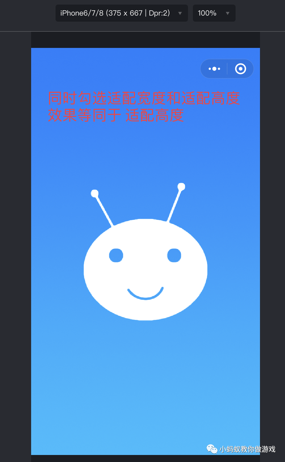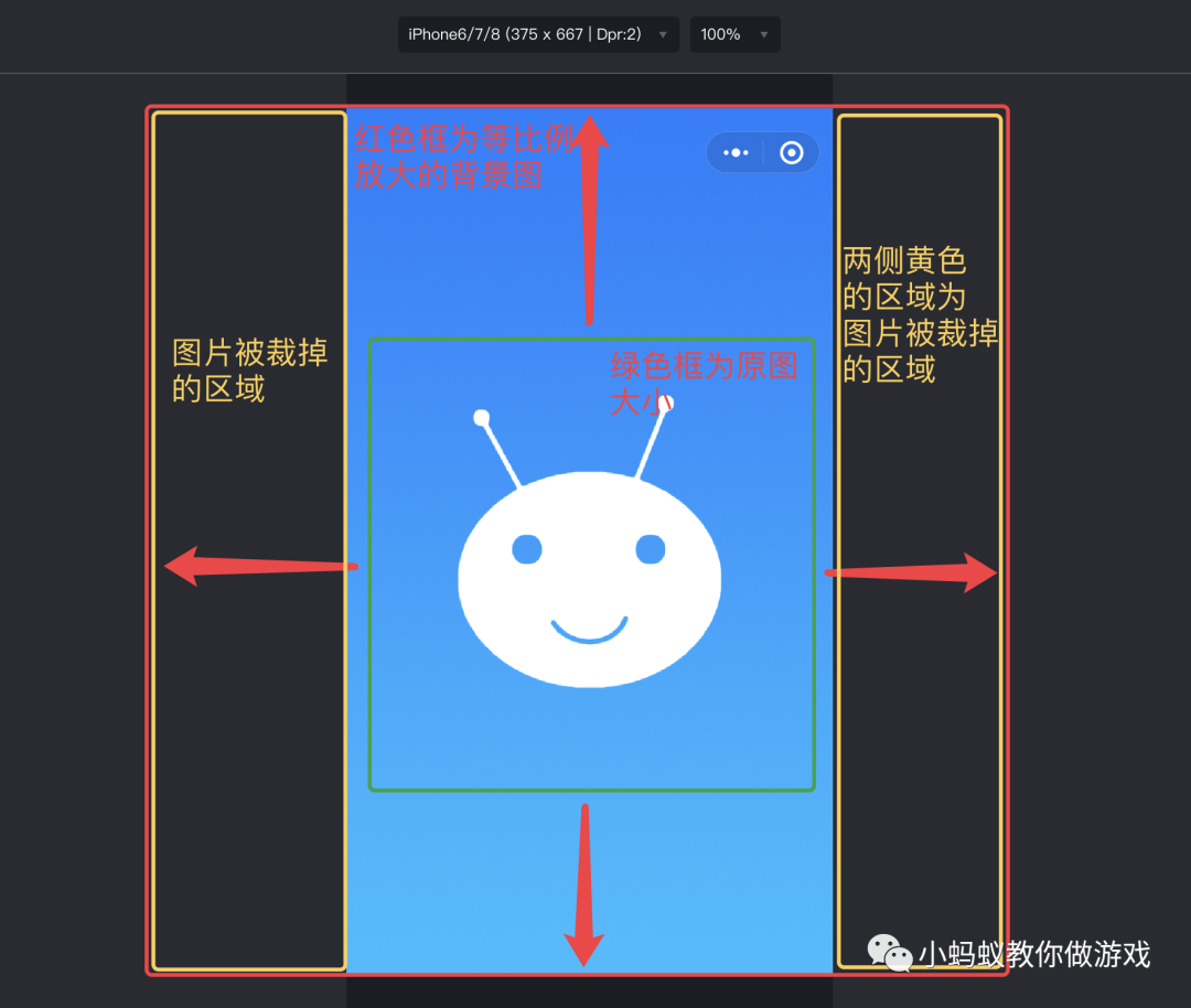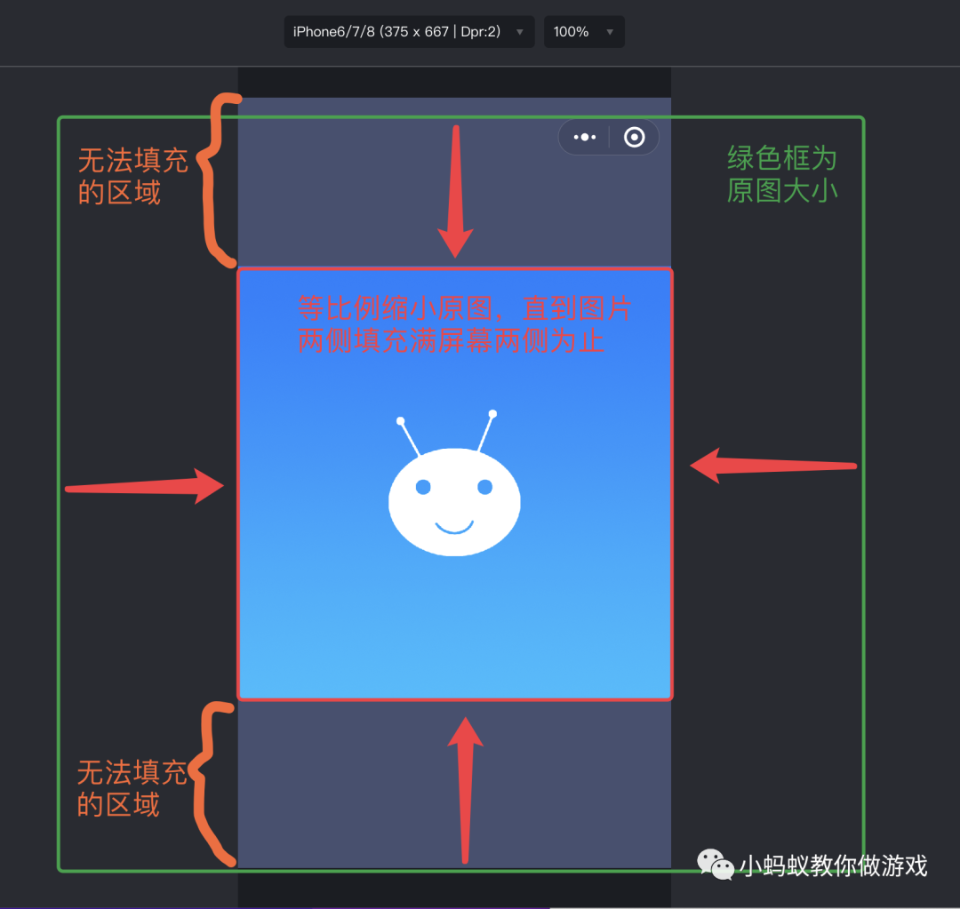 观察一下上方两种不同的屏幕尺寸下的背景图,小蚂蚁的头像被拉长了,因为背景原图是一张 1024x1024 的正方形图片,但是最终的屏幕尺寸都是长方形的,所以就会将正方形的背景图拉长,让其将屏幕填充满。