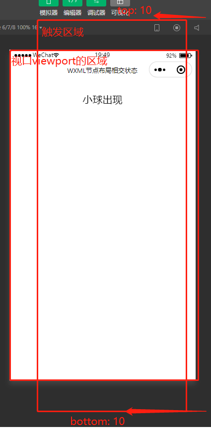 举例说明,下图中的红色部分都为fixed元素,在视口外有个小球,当参照区域与小球相交比例为1时需要做一些逻辑处理。如果我们不做特殊的margins值设置,那么当小球完全进入视口但未完全进入蓝色区域时就会被触发。这显然不是我们想要的,当然我们完全可以通过设置margins为四个方向的负值来完成这件事情。但是在现实开发中,组件多为独立的自定义组件,是否存在和宽高都是未知,我们需要更完整的整套解决方案更为合适。
