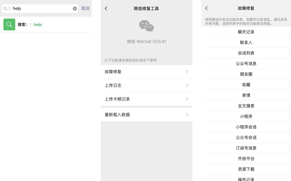 打开手机微信,先点击右上角的+号,接着选择添加朋友选项。跳转到子界面里之后,在搜索框中输入“:help”这串字符进行搜索。之后会跳转到故障修复界面当中,在此界面里,我们选择故障修复按钮,接着选里面的聊天记录选项,可以尝试修复删除的微信聊天记录。