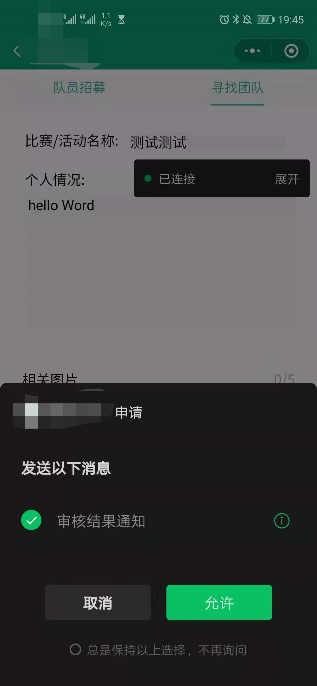 在本例子中,用户提交组队的表单,在成功提交前,询问用户是否接受“审核通过通知”,无论用户选择是或否,表单信息都可以顺利提交。但是选择否,用户则无法顺利收到订阅信息。