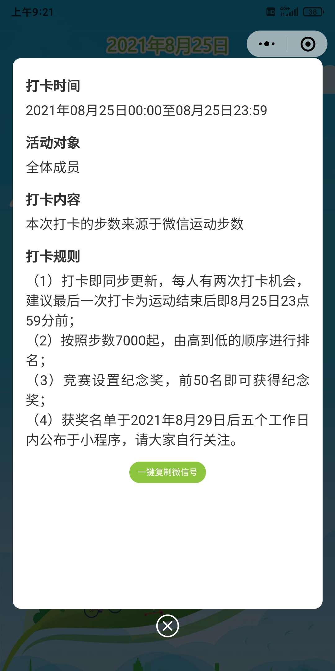 乌兰察布市面向全市直属各单位开展以“低碳生活,绿建未来”为主题的绿色低碳出行比赛-步数打卡活动。打开步数打卡小程序,在活动报名页面,填写姓名、电话、所属单位,点击提交,即可报名参与。进入首页,点击打卡按钮,即可参与打卡。打卡的步数来源于微信运动步数,按照步数7000起,由高到低的顺序进行排名;竞赛设置纪念奖,前50名即可获得纪念奖。