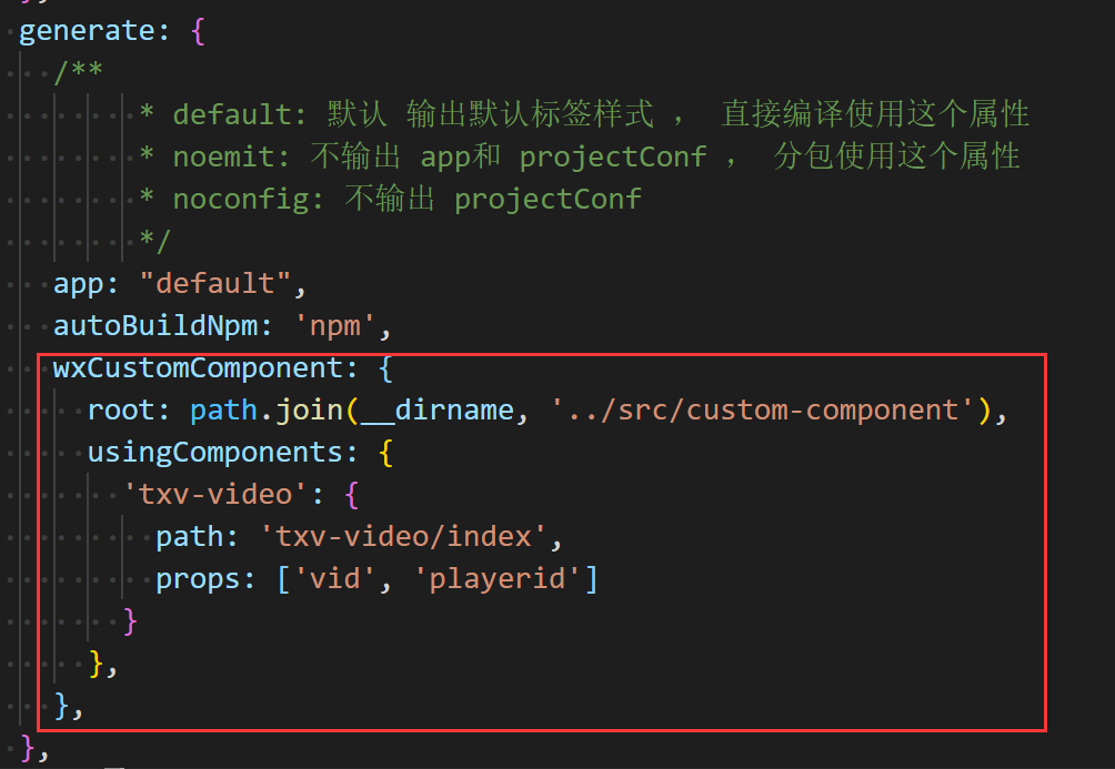 在miniprogrom.config.js中的 generate 字段内补充 wxCustomComponent