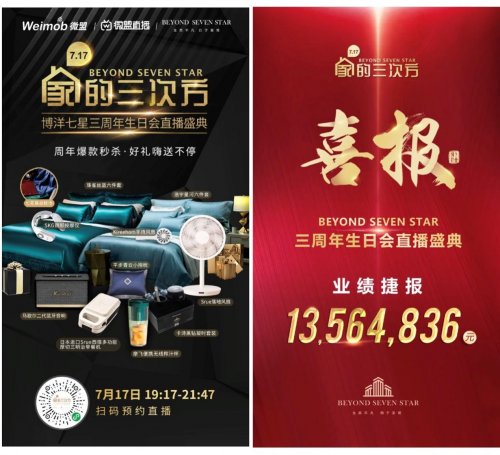 品牌展示和销售业绩可以兼顾吗?近日,博洋家纺旗下高端品牌博洋七星成立三周年之际,借助微盟直播小程序能力开展直播活动,最终以1356万的销量证明二者“可以兼得”。