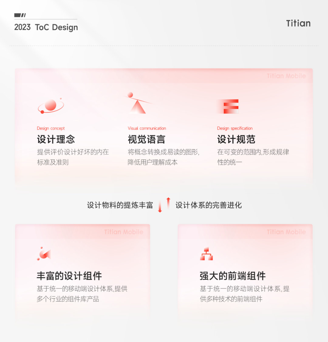 体验设计远不止于核心任务,更需要沉淀与延续设计模式和理念,为后续的设计产出质量与效率提升做基奠。为此,微盟Titian在完成核心任务的同时并行落地了“移动端设计体系”。包含以下三部分:分别为“设计理念”、“视觉语言”、“设计规范”。体系是设计在执行时的规则、标准与指导。