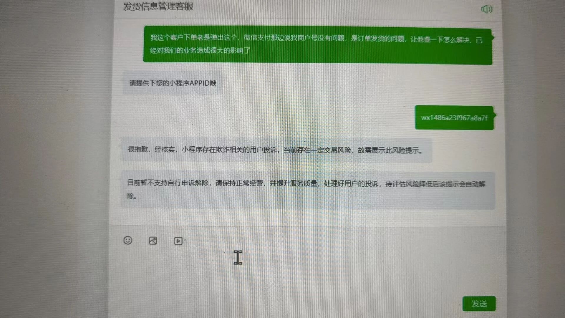 1.13号,小程序收到微信公众号推送强制开通订单发货功能,按腾讯要求开通订单发货后,次日小程序出现用户支付提示该交易可能存在风险,请仔细核实金额,第一时间查看了小程序绑定商户无任何违规,商户无限制,致电微信支付客服,告知与小程序绑定的商户号一切正常。咨询订单发货客服,,小程序存在欺诈相关的用户投诉,当前存在一定交易风险,故需展示此风险提示。第一时间查看了最近的用户投诉,且近三十天客户发起投诉为5单,均以跟客户解释清楚并且协商处理完毕。目前小程序仍然被提示交易风险,已经给运营带来了很大的问题,且用户流失率相当高,咨询微信支付客服,告知去咨询小程序客服,咨询小程序客服被告知咨询订单发货客服,一直得不到一个提示的原因和处理的结果,此前其他小程序账号也出现过类似问题,后来变更主体才解决这个问题,我想问一下能不能出来个官方人员负责跟进处理一下这个事情,如果小程序哪块有问题,希望告知,这边好尽快处理改正完善。