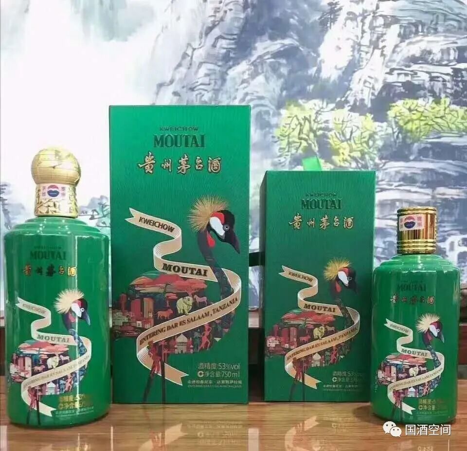 【走进坦桑尼亚】外观主色调为墨绿色,由坦桑尼亚国旗绿蓝黑黄四色综合而成,同时代表当地终年绿意盎然,是非洲重要的旅游胜地。前标处以坦桑尼亚国鸟灰冠鹤为主画面,将带有当地特色的文化、景观、动物、建筑等融入灰冠鹤的腹部,构思巧妙。尾部为轮船靠岸,寓意达累斯萨拉姆是“平安之港”。灰冠鹤背部为非洲第一高峰、世界最大死火山之一的乞力马扎罗山。大象、长颈鹿、斑马等野生动物,热带植物,现代建筑,赤脚舞蹈的人形等,极具当地风情。“贵州茅台 走进坦桑尼亚·达累斯萨拉姆”的金丝带贯穿正标元素,象征一带一路带来的中坦友谊。