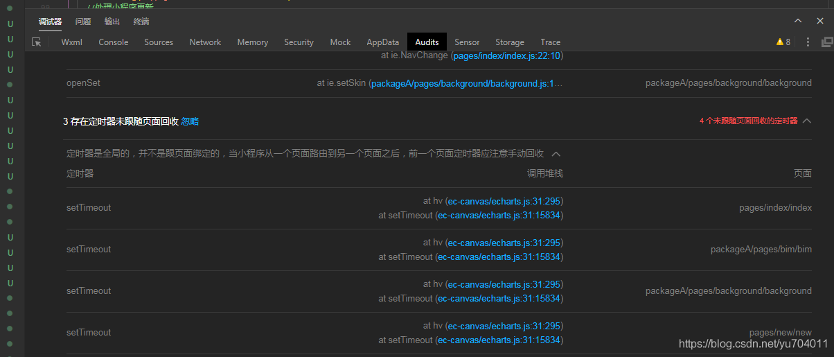我的小程序中引入echarts 用来做图表 我只是用初始化 和setOption()的函数 日常使用正常 但是用小程序开发工具的Audits测评 说是存在定时器未跟随页面回收 都是echarts.js里面的 我实在搞不懂这东西 看看哪位大佬帮我解决下