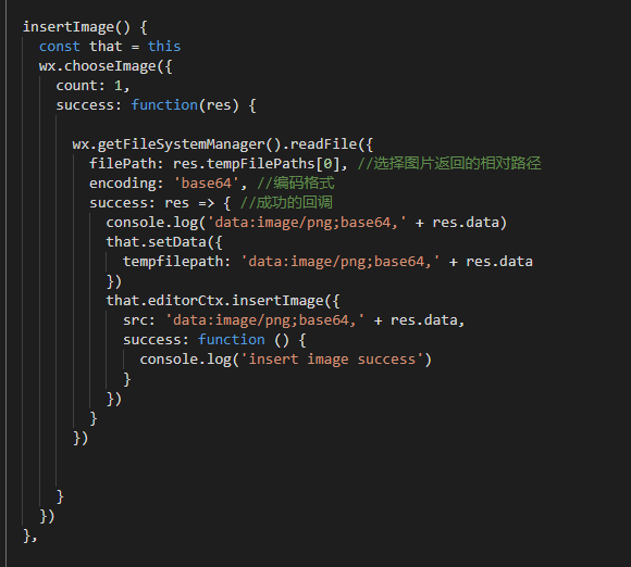 因为editor.insertImage方法仅支持 http(s),base64,云图片 格式 使用wx.chooseImage获得tempFilePaths[0] 的本地图片url 在模拟器上是http格式,可以正常显示,但是真机就会报错,因为真机的格式是wxfile: 所以我们可以把url的格式转为base64这样就可以正常显示了 下面是代码: