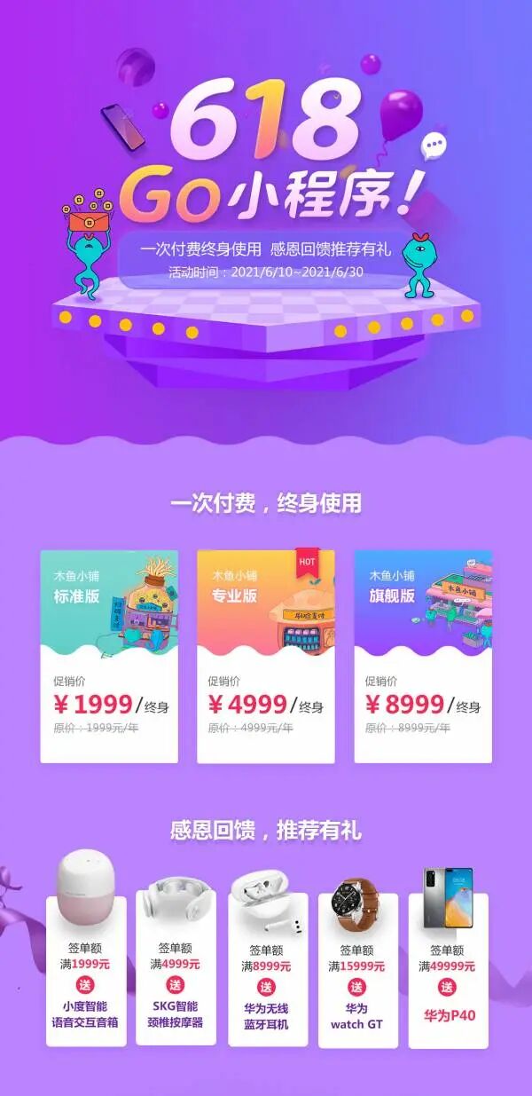新零售商城小程序服务商木鱼小铺“618Go小程序!”年中活动已开启,“一次付费终身使用、感恩回馈推荐有礼”双重活动回馈新老客户,助力中小商家实现数字化转型升级!